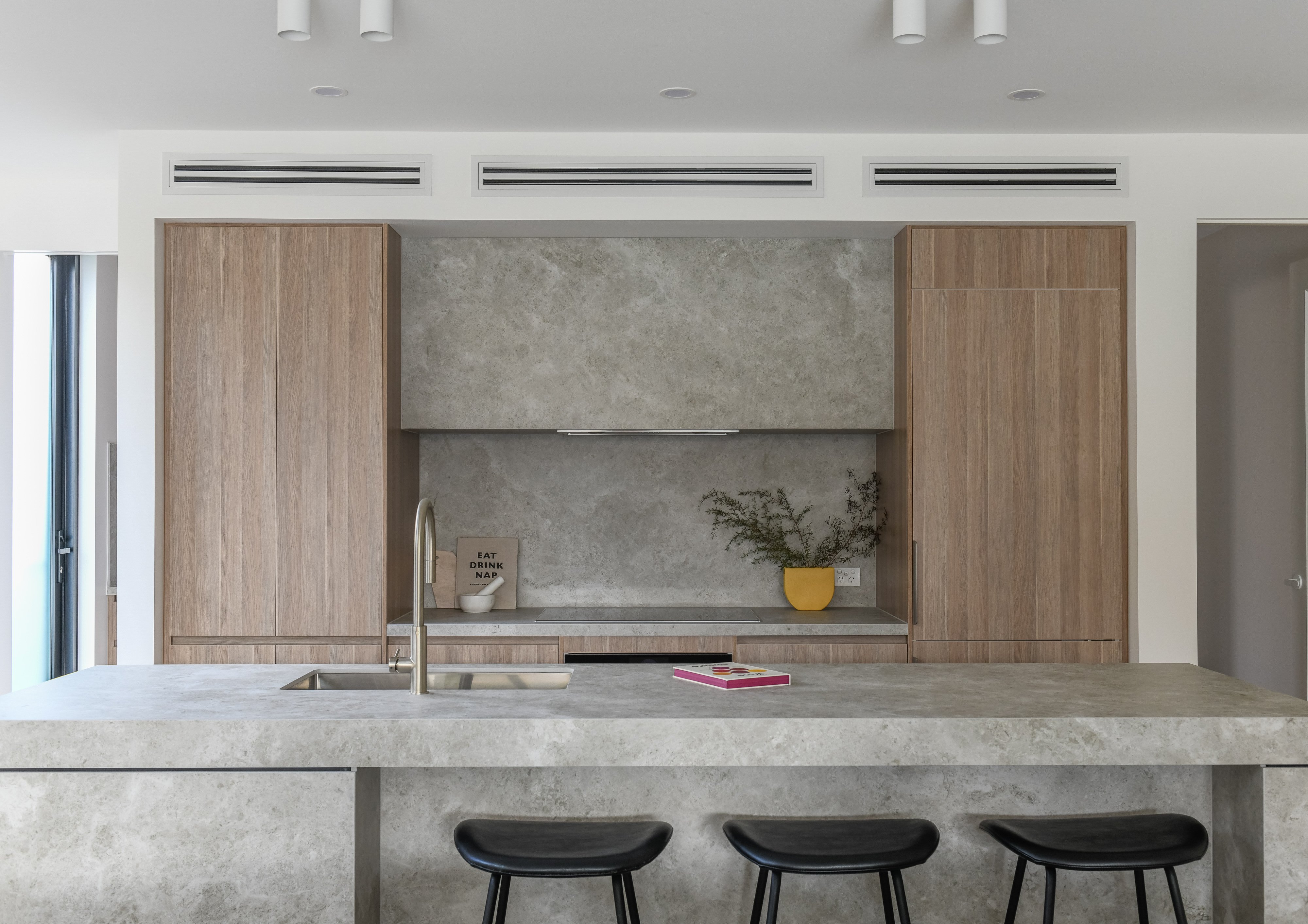 This striking coastal new-build designed by acclaimed architects DW Architects showcases the beauty and versatility of HONE’s Tundra Platinum Sintered Stone, used extensively throughout the home to create a cohesive, high-end aesthetic. From the designer kitchen with a stone-clad concealed rangehood, to the custom powder room vanity, living room entertainment unit, and outdoor alfresco areas, the stone provides a consistent and refined architectural finish across both interior and exterior spaces. Paired with a mix of light and dark joinery, Tundra Platinum delivers a timeless, contemporary palette while demonstrating the durability and flexibility of sintered stone across a wide range of applications. In the bathrooms, the stone is complemented by HONE’s Monte Ash tiles, adding warmth and texture while reinforcing the home’s sophisticated coastal design language.
